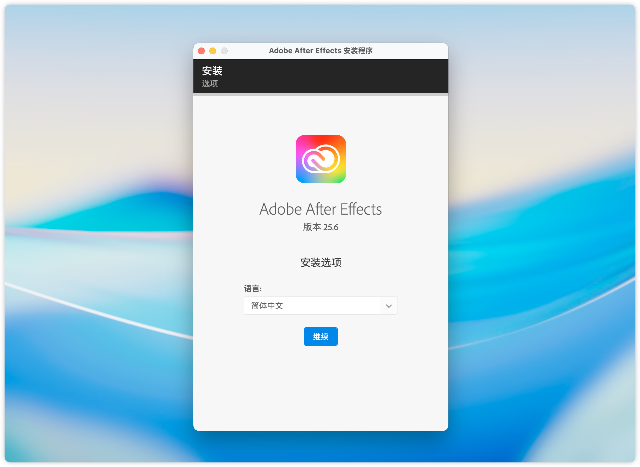 10、开始进入 After Effects 2025 安装界面,点击继续即可。