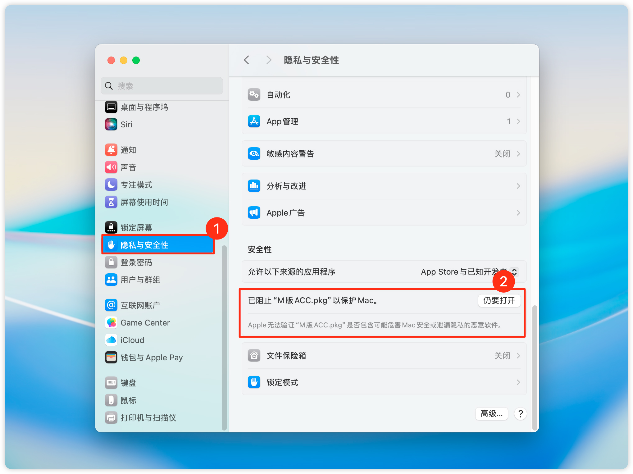 4、打开系统设置 → 隐私与安全性 → 仍要打开,点击仍要打开即可正常安装。