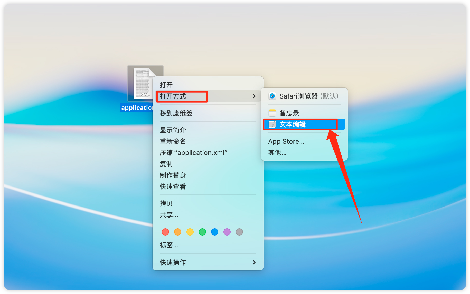 19、鼠标右键 application.xml文件,在 打开方式 中选择 文本编辑。