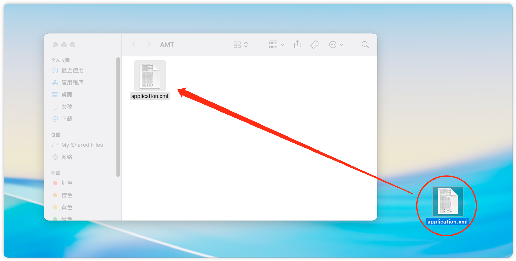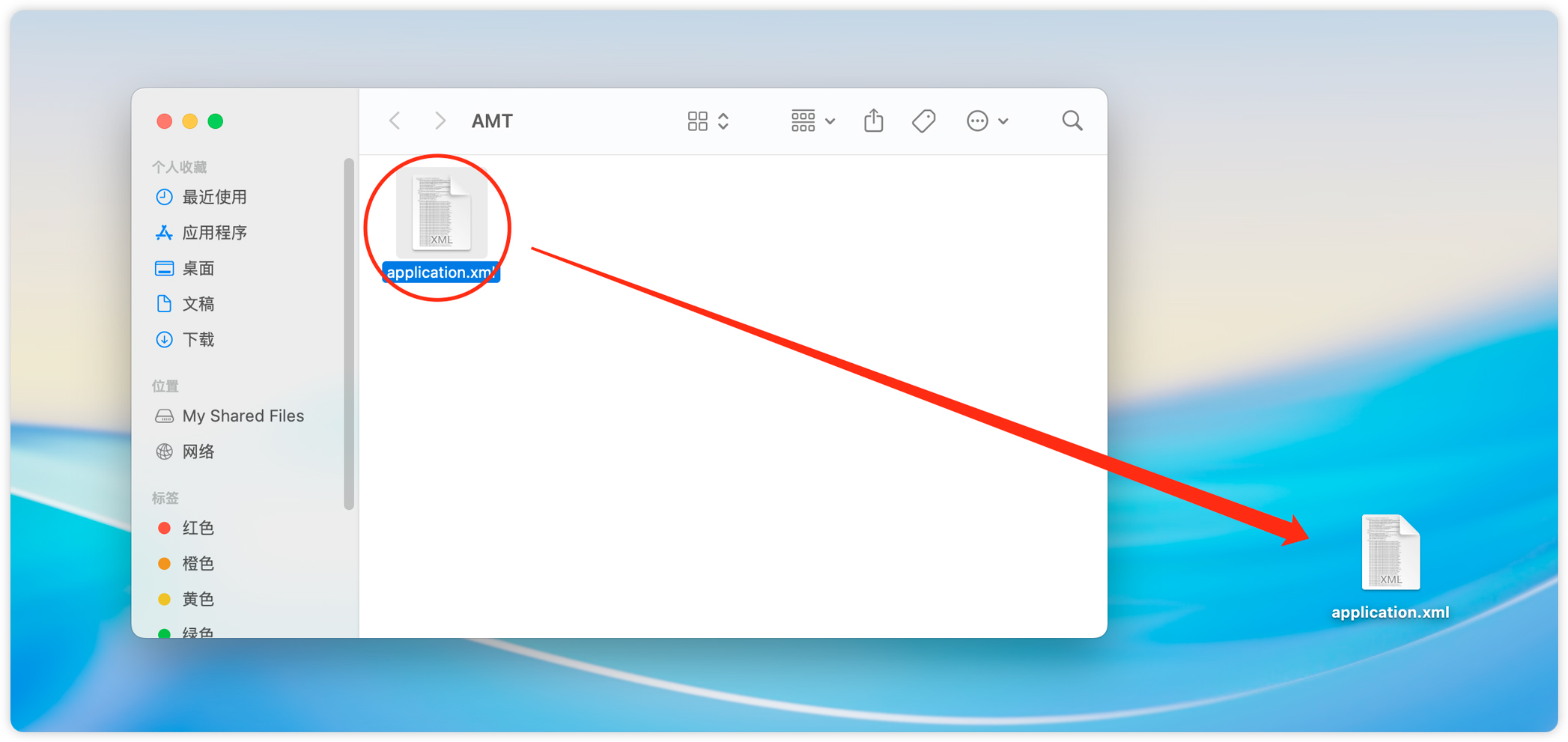 18、将 application.xml 文件,拖到桌面上。(注意文件夹页面不要关闭,后面还要用到!)