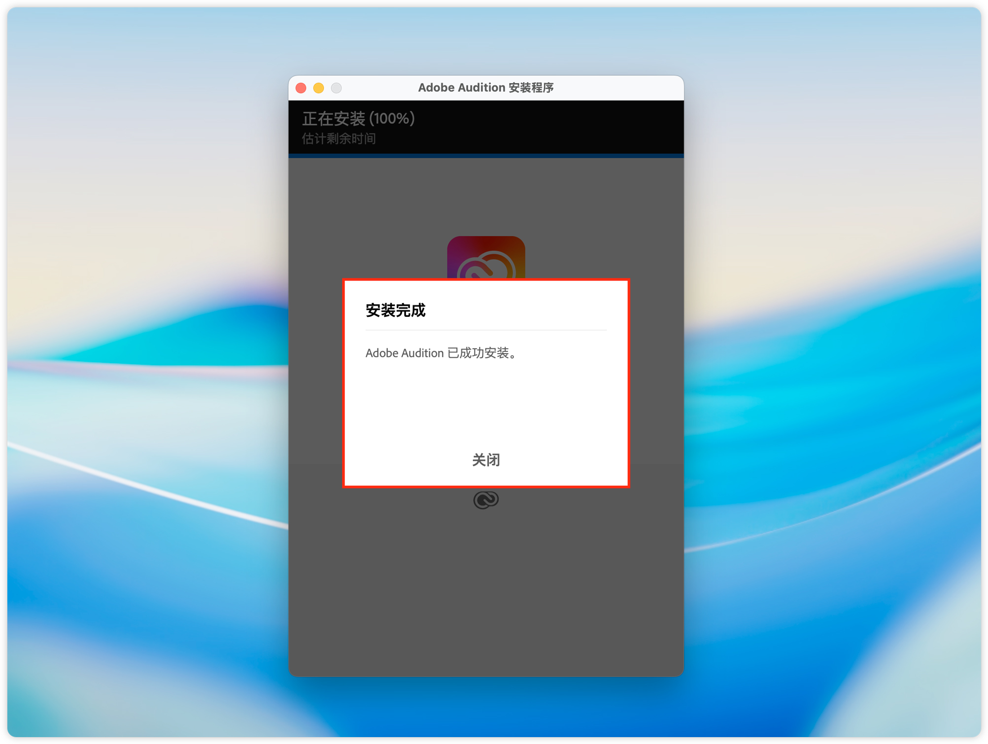 11、等待安装界面,提示安装完成后,关闭安装界面即可。