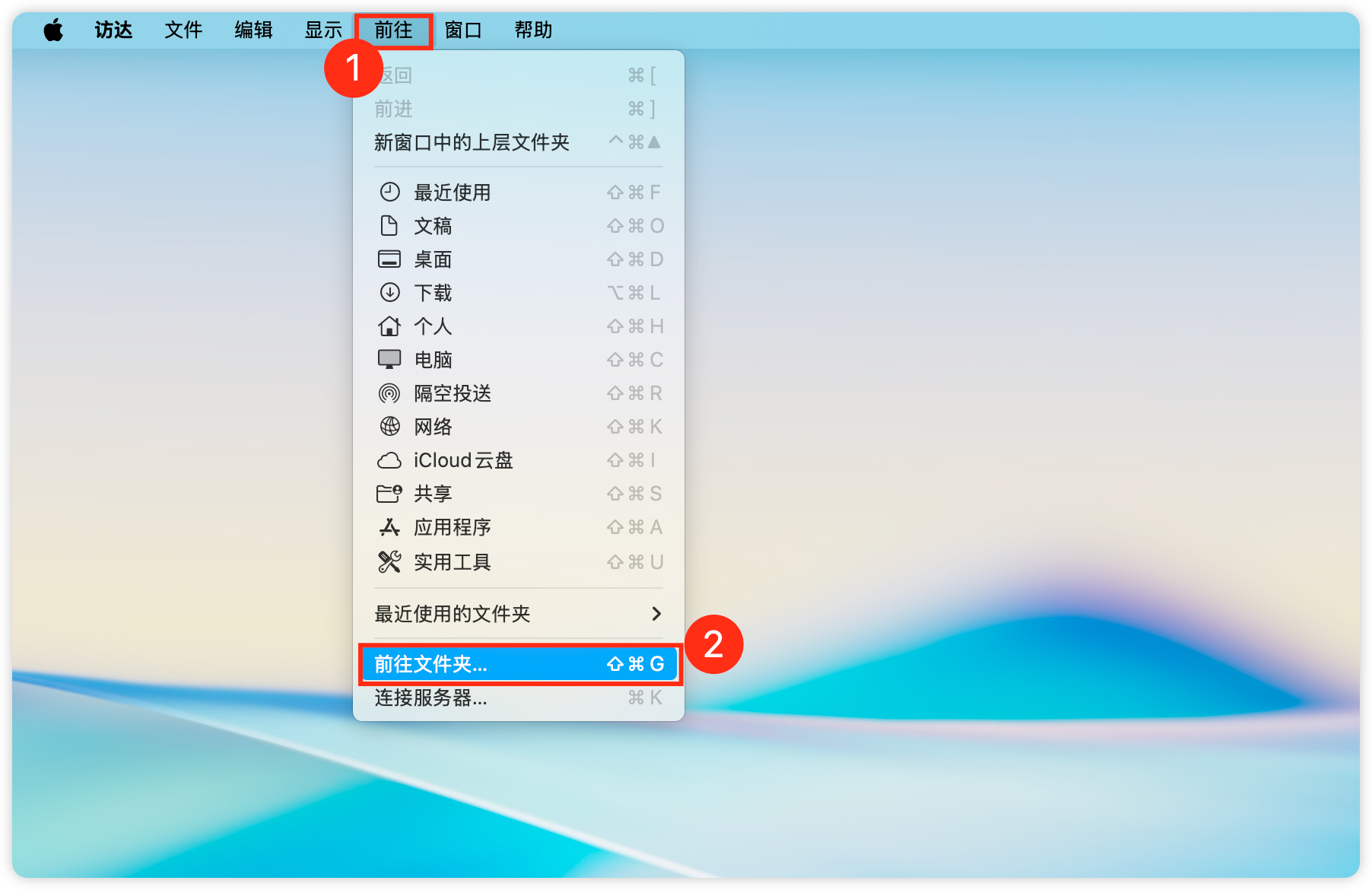 16、点击 顶部菜单栏 >> 前往 >> 前往文件夹,打开窗口;或者按键盘快捷键 Shift (⇧) + Command(⌘)+G。