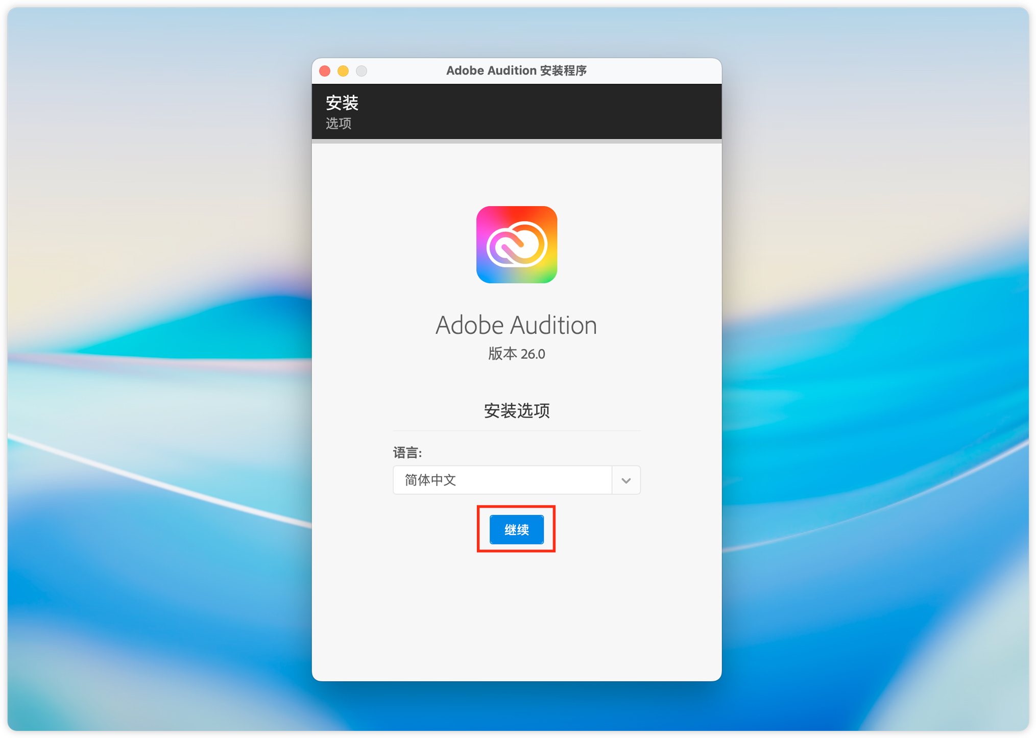 10、开始进入 Adobe Audition 2026 安装界面,点击继续即可。(语言选择默认即可,教程底部有修改简体中文的说明)