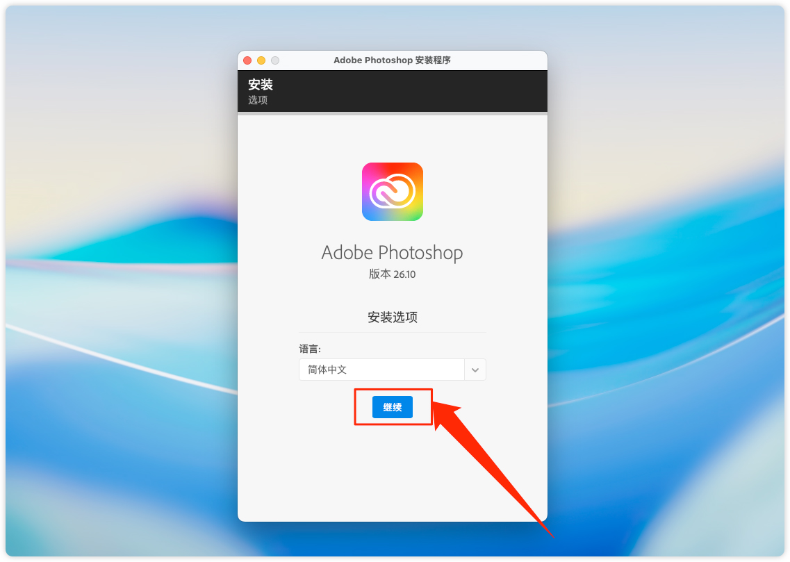 10、开始进入 Photoshop 2025 安装界面,点击继续即可。