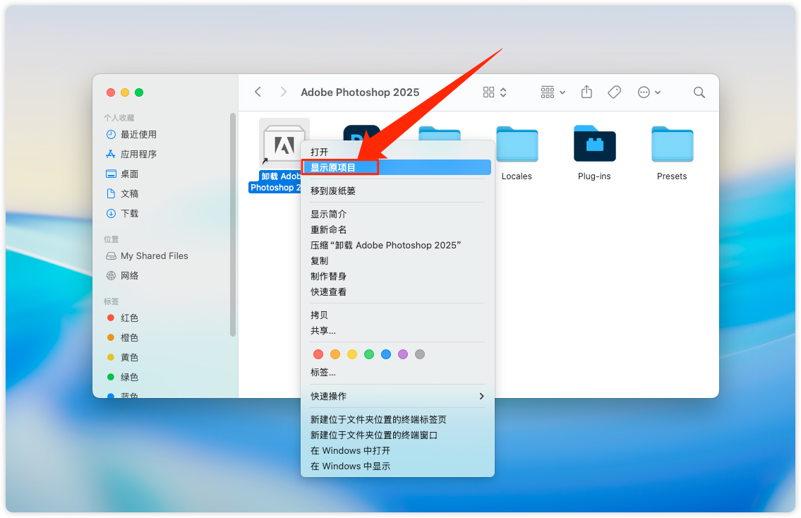 18、右键 Adobe卸载工具,选择 显示原项目。