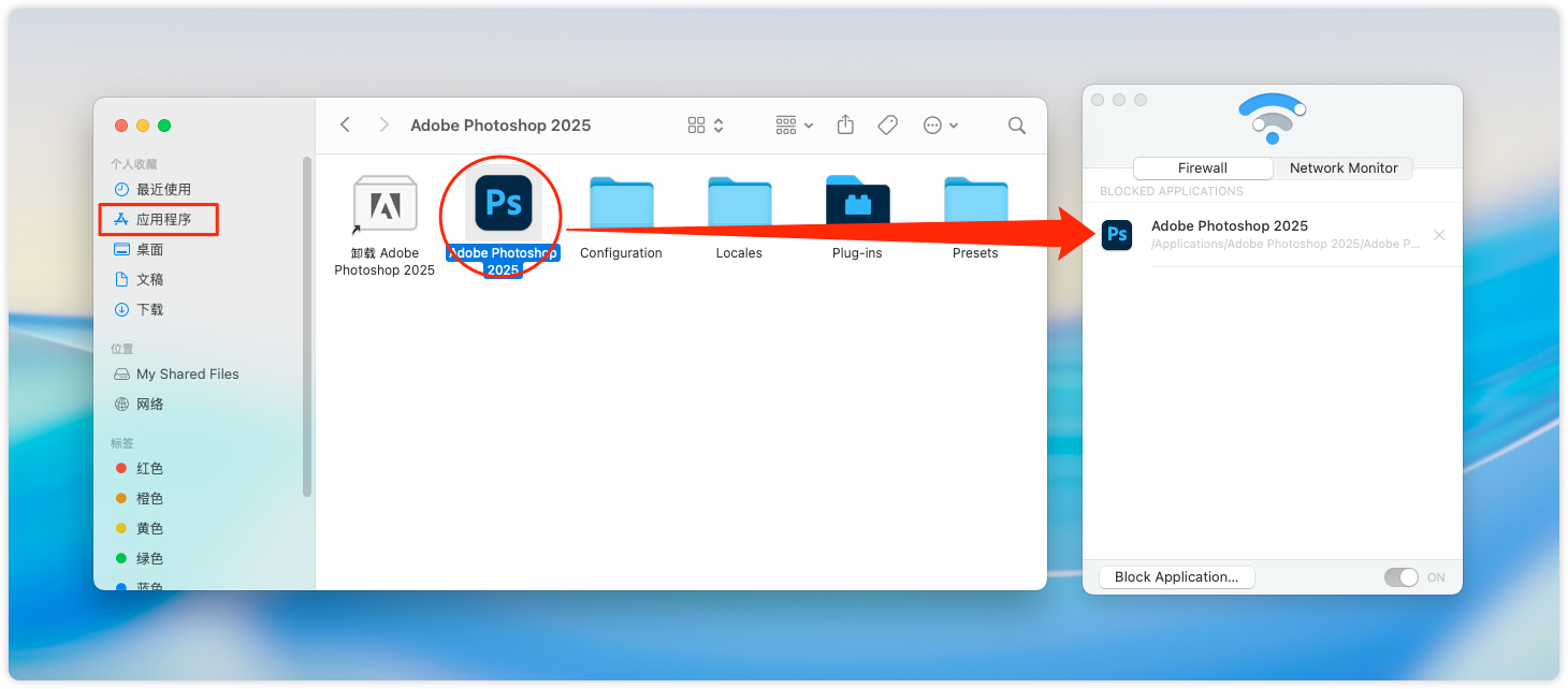 16、打开 访达 → 应用程序,找到 Adobe Photoshop 2025文件夹,打开后将里面的 PS 2025 拖到防火墙里 。