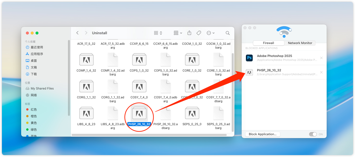 17、打开 访达 → 应用程序,找到 Adobe Photoshop 2025文件夹,打开后将里面的 PS 2025 拖到防火墙里 。