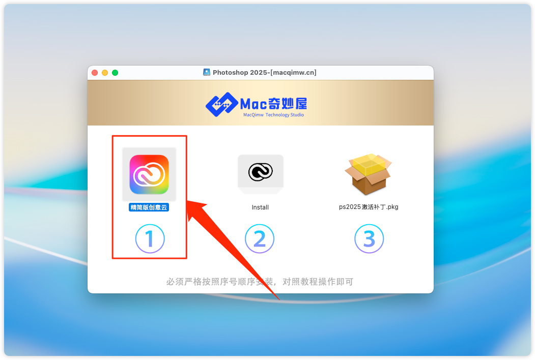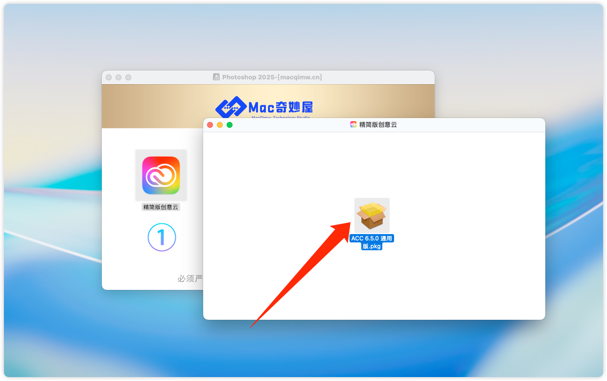 1、打开Photoshop2025安装包,开始安装 “精简创意云 ”。 (如果电脑上已安装ACC,请忽略此步骤)