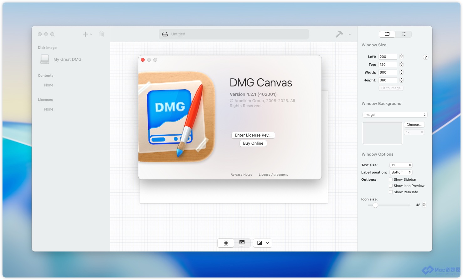 - 简单的背景:使用背景布局视图,您可以在DMG Canvas内部为您的磁盘映像创建出色的背景。只需放置图像,添加自定义文本,您就可以快速完成。
