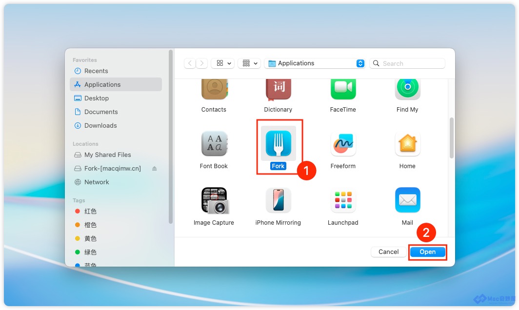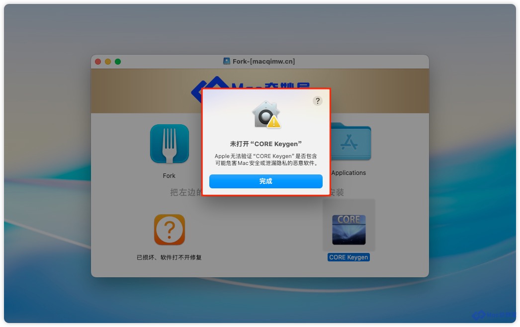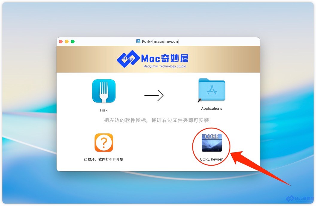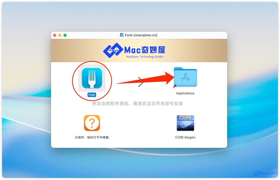 1.Fork下载完成后打开,拖动左侧的软件到右侧应用程序中