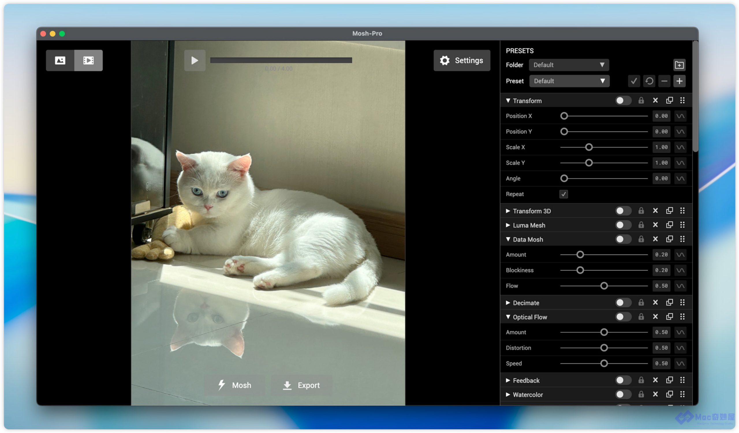 Mosh Pro 是一款功能齐全的桌面应用程序,提供实时视觉特效混合器,可对图像、视频和 GIF 进行无限的创意控制。60多种特效,可堆叠和重新排列,实现无限组合。专为最大限度地发挥图像和视频创意而设计。