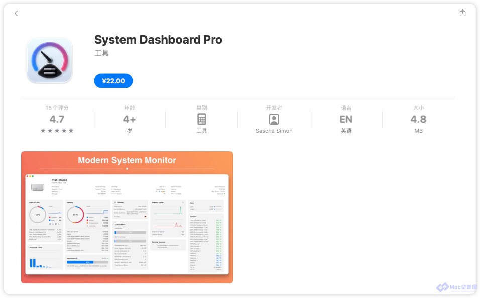 System Dashboard Pro 是一款 macOS上的系统监控工具。它可以提供有关您的Mac及其硬件组件,如CPU、内存、磁盘使用情况、温度等的实时信息。此外,它还可以显示网络活动和应用程序行为,以便您可以更好地了解您的Mac正在运行什么和如何运行。